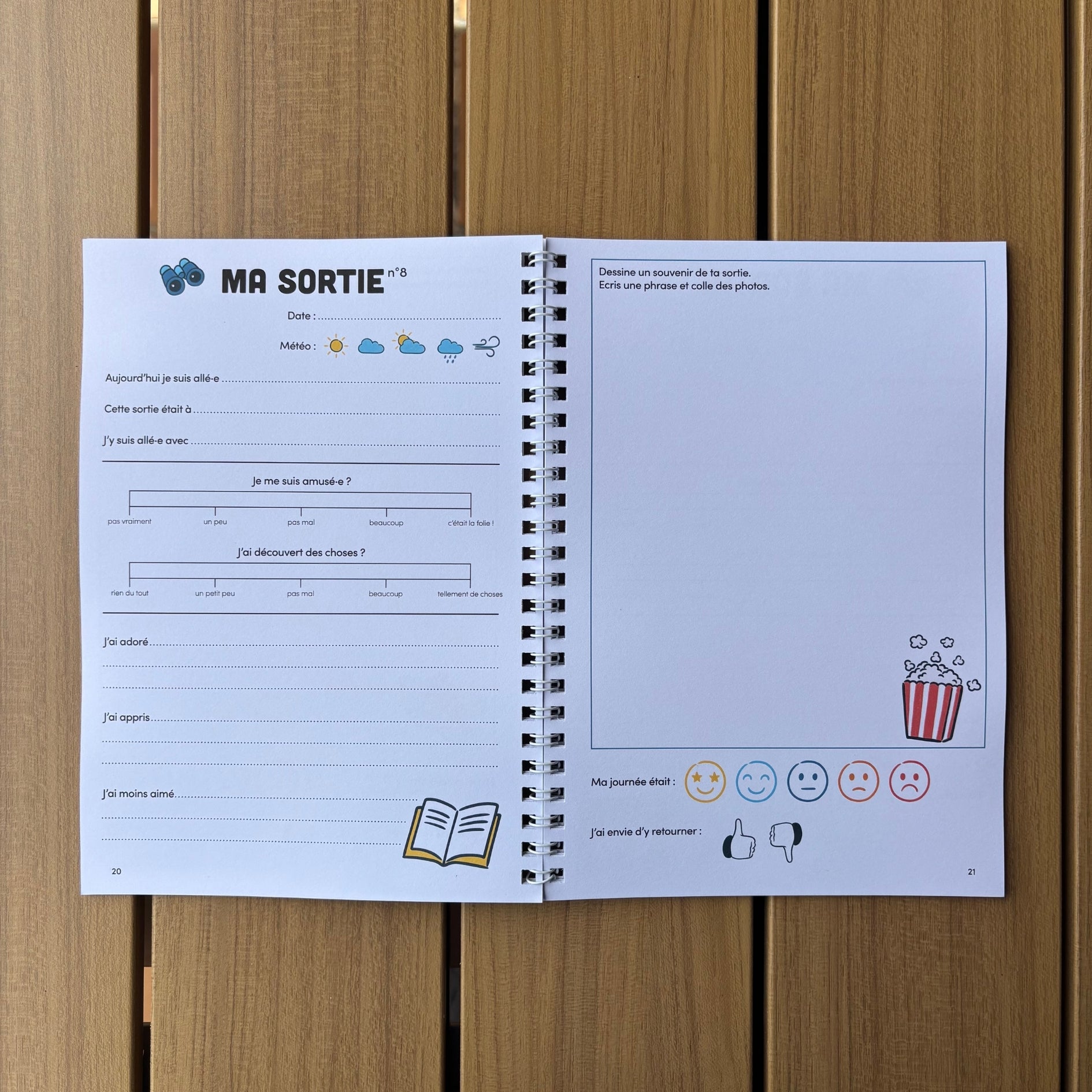 Encouragez l’enfant à écrire ou dessiner ce qu’il a aimé à chaque sortie. Ajoutez stickers ou photos pour personnaliser le carnet